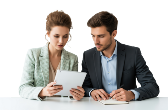 Businessman analyzing invisible product at table transparent background