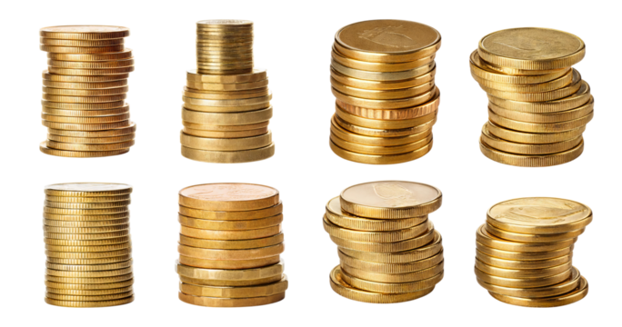Transparent PNG 3D Financial Growth Money Investment and Wealth Profit Concept with Gold Coins Isolated on White Background.