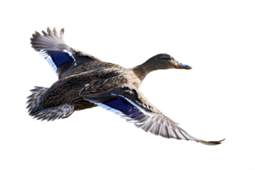 wild duck flying in beautiful light isolated on white background,  PNG.