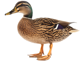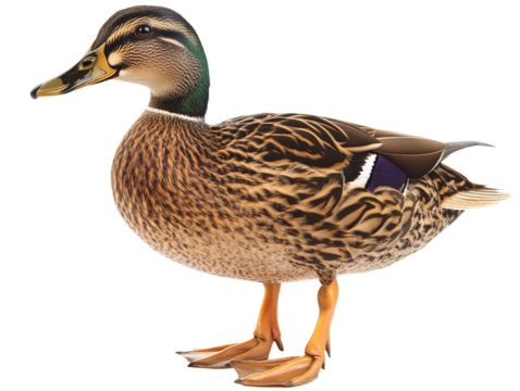 Mallard, cartoon waterfowl male wild duck. Bird with green head and white collar, brown wings and body, webbed feet. Cute wild drake standing, ornithology mascot, cartoon duck vector illustration
