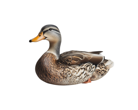 A brown female mallard duck, a wild waterfowl bird with a distinct beak and feathers on transparent background
