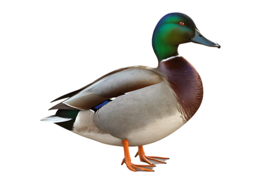 A mallard duck, a wild bird with green and brown feathers, is isolated on transparent background