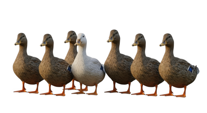 A Flock of Ducks on a Sunny Day with a White Duck Leading the Group