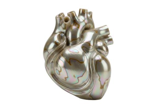 Isolated mother-of-pearl anatomical human heart object, medical artwork, pearlescent sheen art