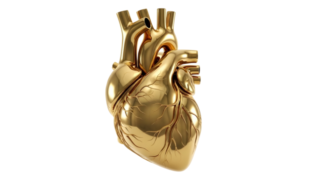 Human heart reimagined as bio tech engine, glowing tubes and chrome tissue, isolated on a white background