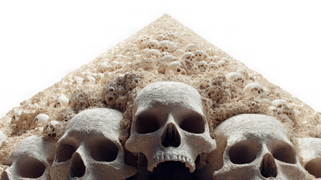 A chilling pyramid formation of human skulls evoking themes of death horror and the macabre isolated on transparent background