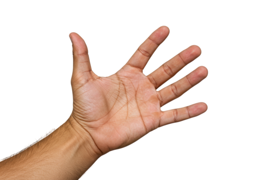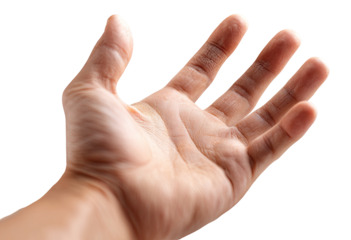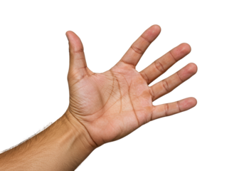 Human hand open isolated on transparent background, showing five fingers in detail