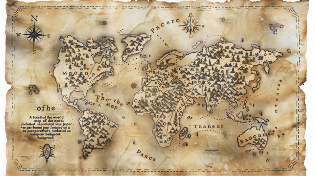 Detailed antique world map on parchment paper with compass rose