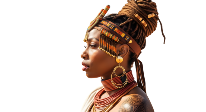 Portrait of a beautiful himba woman with traditional headdress and jewelry, isolated on transparent background