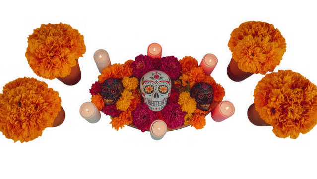 Day of the dead display with decorated sugar skulls marigolds and candles isolated on transparent background