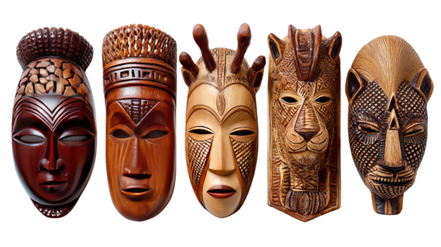African Masks: An enchanting collection of five intricately carved wooden masks, showcasing the rich artistic heritage and cultural symbolism of Africa.