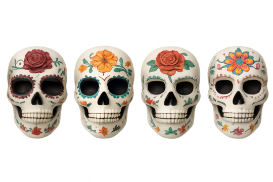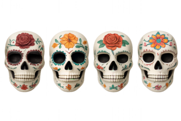 Colourful skulls dedicated to the Mexican Day of the Dead without a background