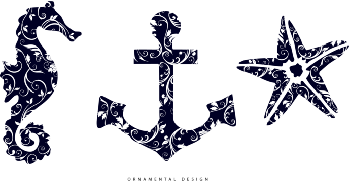 Silhouettes decorated with Victorian ornaments and curls. Seahorse, anchor and starfish: symbols, logo idea, elegant designs for luxury composition.