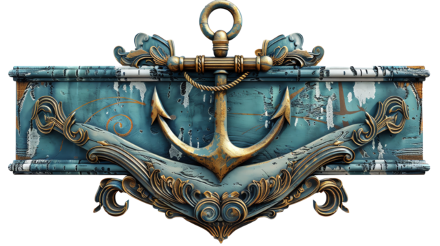 Vintage ornate anchor emblem with detailed maritime design, featuring decorative elements and a weathered, rustic finish.