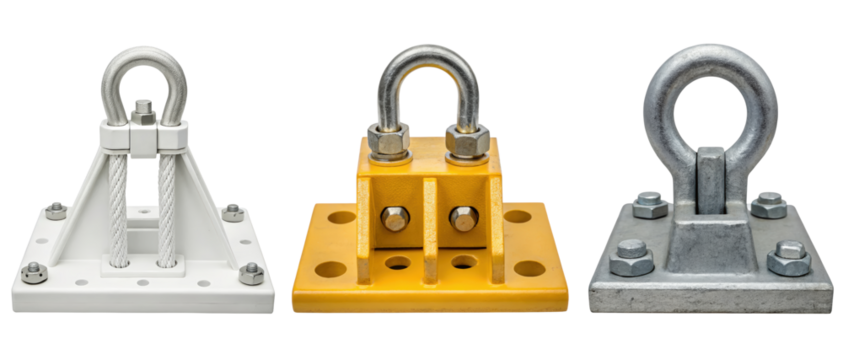 Three metal anchor points with rings on a transparent background