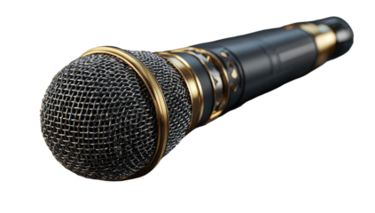 Elegant black and gold microphone with textured grille against a dark background