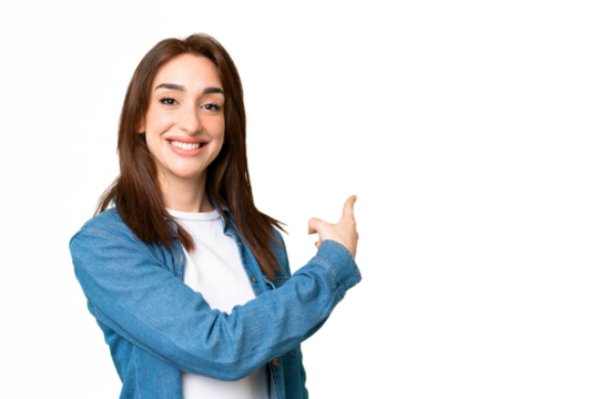 African american woman talking into microphone, pointing, giving speech, speaker presenting ideas, transparent background
