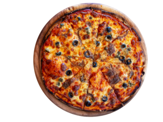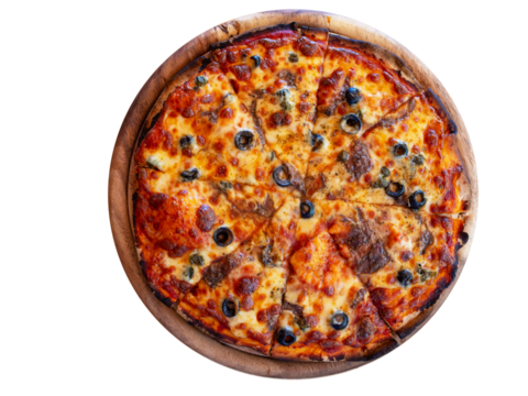Pizza fromage câpre anchois olive vu de dessus découpée sur un support en bois rond
