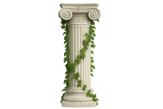 Ionic column structure with classical greek capital and marble texture, featuring green ivy climbing, isolated on transparent background