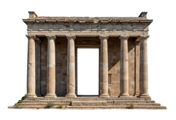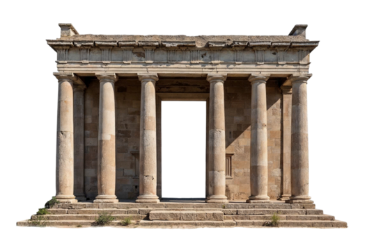 Ancient greek doric temple ruins with stone columns and steps on transparent background, PNG