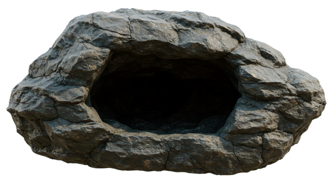 Natural rock formation with cave opening isolated on transparent background