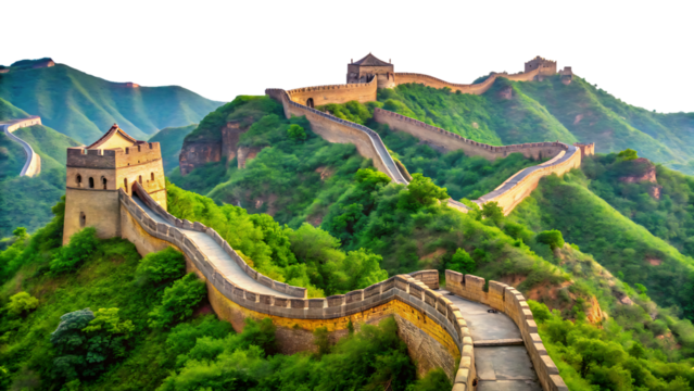 Great Wall of China, winding over lush green mountains with watchtowers and stone battlements, cutout, PNG, isolated on white or transparent background, AI