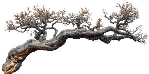 A gnarled and ancient bonsai tree with intricate branches and textured bark showcasing its unique form and character isolated on transparent background