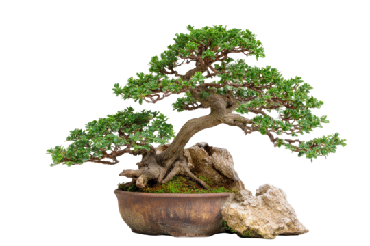 Majestic ancient bonsai tree with gnarled trunk and lush green foliage showcasing intricate natural artistry isolated on transparent background
