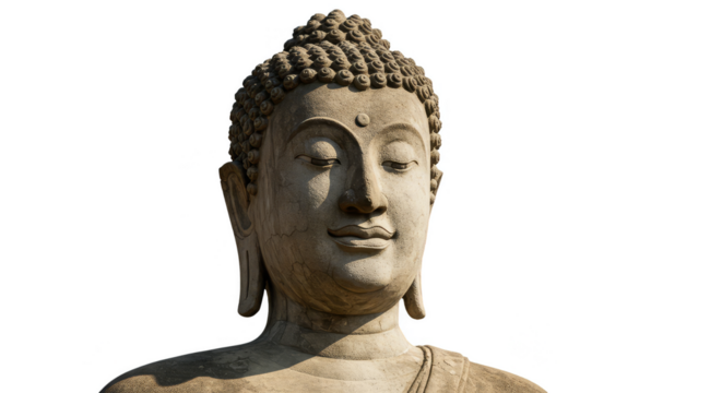 Stone buddha head with moss and cracks symbolizing meditation, spirituality, and ancient wisdom on transparent background