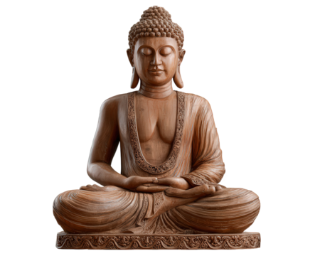 Rustic wooden Buddha statue carving sitting in serene meditation. This spiritual clipart object shows peaceful expression and traditional Buddhist art isolated