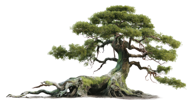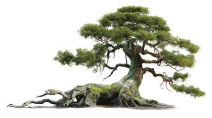 Ancient Bonsai in Tranquility: A timeless bonsai, sculpted by nature's hand, embodies serenity. This serene image captures the essence of Zen with the tree's gnarled roots and lush, green canopy.