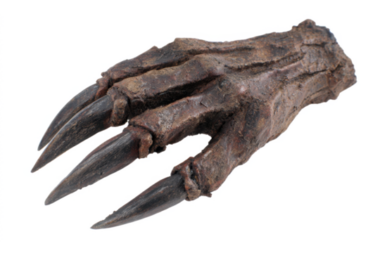 A realistic prop of a dinosaur claw, resembling a fossilized appendage with sharp, dark talons.
