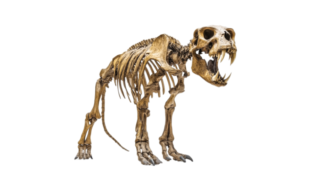 Majungasaurus dinosaur skeleton isolated on transparent PNG, prehistoric predator fossil for paleontology and educational resources