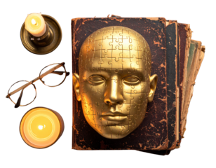 Golden Puzzle Piece Human Head with Books and Candlelight