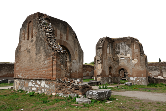 Ancient Roman brick ruins with weathered stone arches
