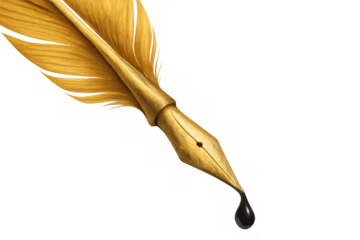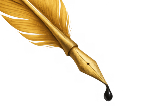 Golden quill pen with ink dropping from vintage nib, writing and calligraphy concept, transparent background