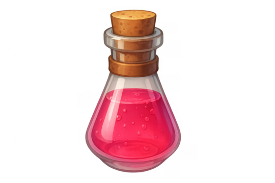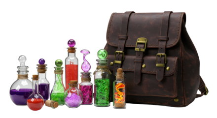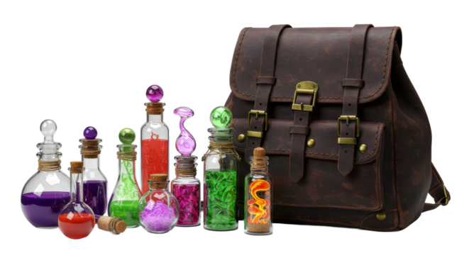 Leather Adventurer’s Backpack with Colorful Glass Potion Bottles, Fantasy Alchemy Set for Magic, RPG, and Role-Playing Games isolated .