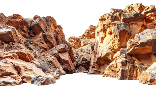Large, rugged orange and brown rock formations with jagged edges and textured surfaces dominate the scene.