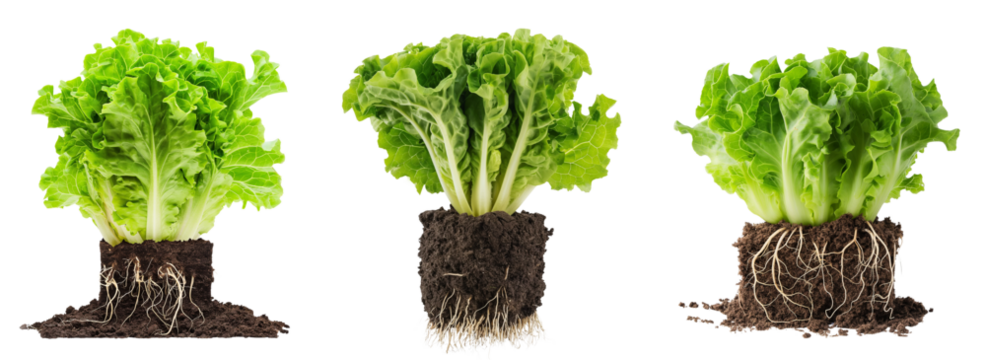 Set of green lettuce leaves with roots in soil isolated on a transparent background, Cutout PNG