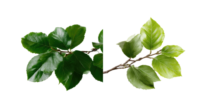 Two plant branches with contrasting leaves.  A pair of  leafy branches, one with deep green leaves and the other with a pale green/yellow tone.  Sharp focus on the leaves, showing fine details.