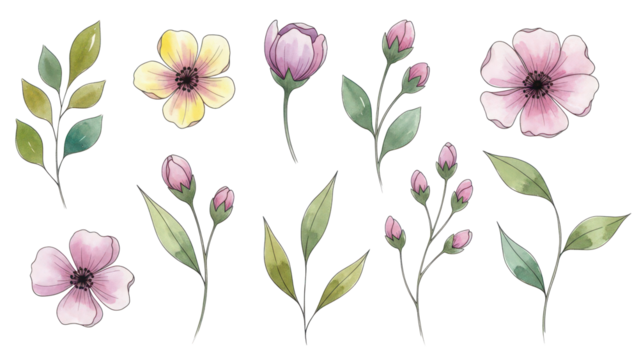 Flowers and leaves set, floral watercolor illustration for greeting card, invitation and other printing design. Isolated on white. Hand drawing.