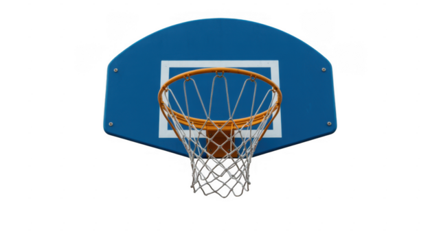 Basketball hoop and net with blue backboard and white square isolated on a transparent background