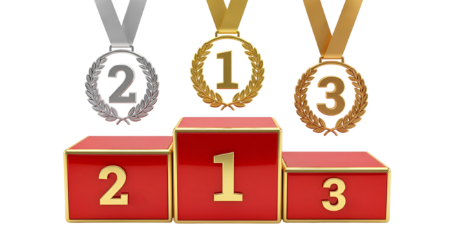 3D render of a glossy red and gold winners podium with gold, silver, and bronze-colored medals for first, second, and third place achievement, isolated on transparent background.