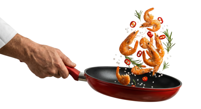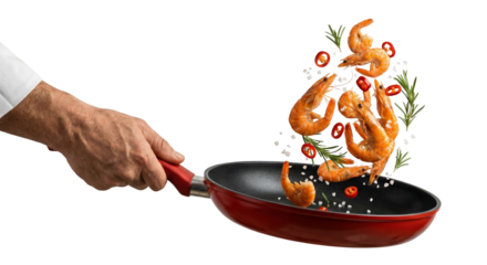 Chef Flipping Shrimp in Frying Pan with Chili and Herbs