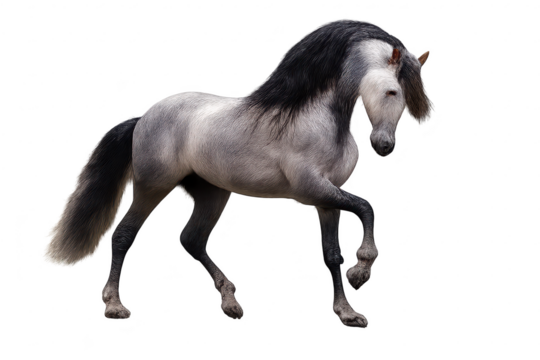 Powerful Dapple Gray or White Horse Galloping with Majestic Flowing Mane, isolated on a white background, cutout, PNG
