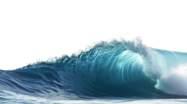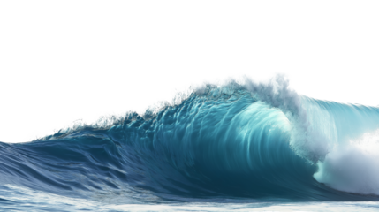 Crystal-clear blue wave captured mid-splash, ocean energy, isolated on white background, PNG format
