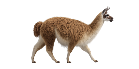 Brown and white llama walking side view isolated on a transparent background