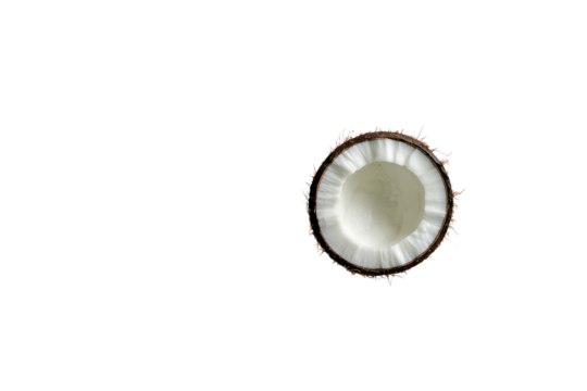 A fresh coconut split in half with the interior visible, surrounded by vibrant green tropical leaves, placed on a clean white background