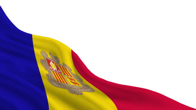 A flag is waving showing blue, yellow, and red colors with a coat of arms. The scene captures the flag's movement in a lively way. This is a symbol of Andorra.