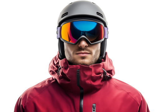 Andorran skier in red thermal jacket and goggles isolated on transparent white background